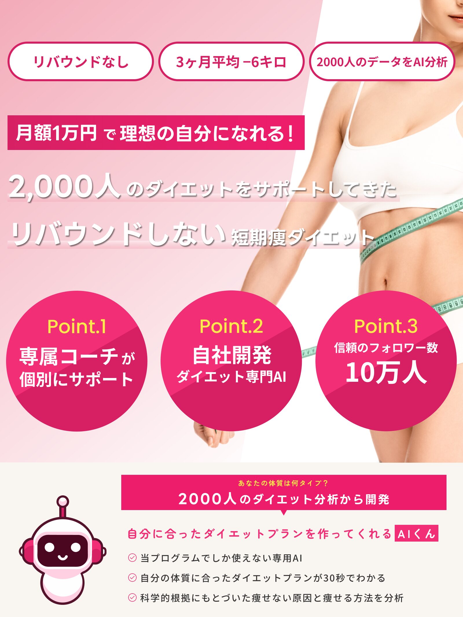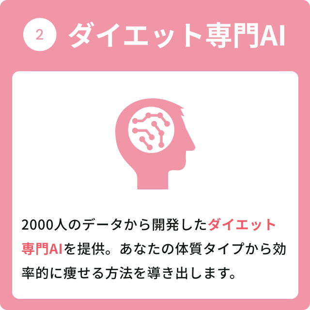 1対1の個別サポートに、2,000人のデータから開発したダイエットAI、さらには仲間を作るためのコミュニティーまでご用意しました。